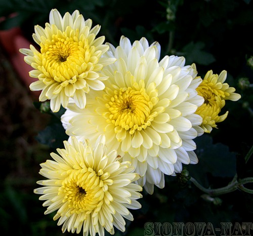 Элен- куст высокий до 1,2 м, с крупными белыми махровыми соцветиями, с желтоватым центром, среднего срока цветения